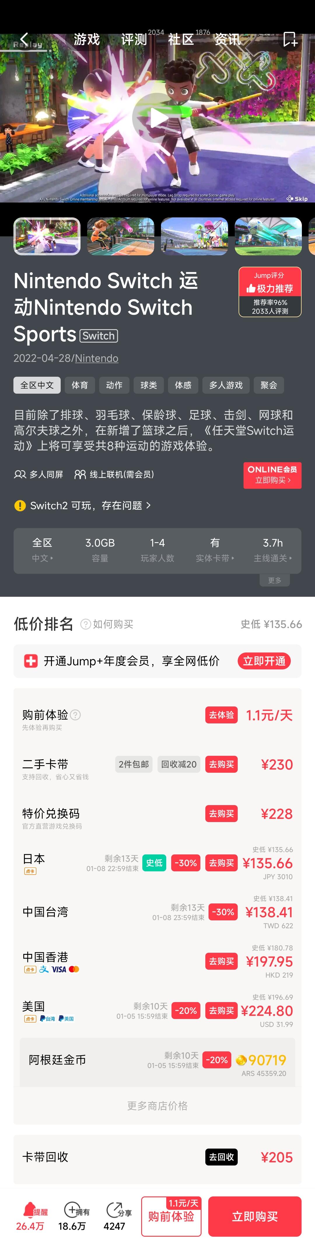 nintendo switch sports数字版的,趁着日区史低了,就抓紧入手了,不用买卡带了,不然拔插也挺麻烦的,有氧拳击3是因为12.5之前还能领金币(阿根廷区1418个),所以买的卡带,放进去就没拿出来过了